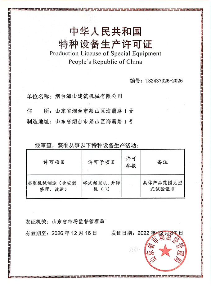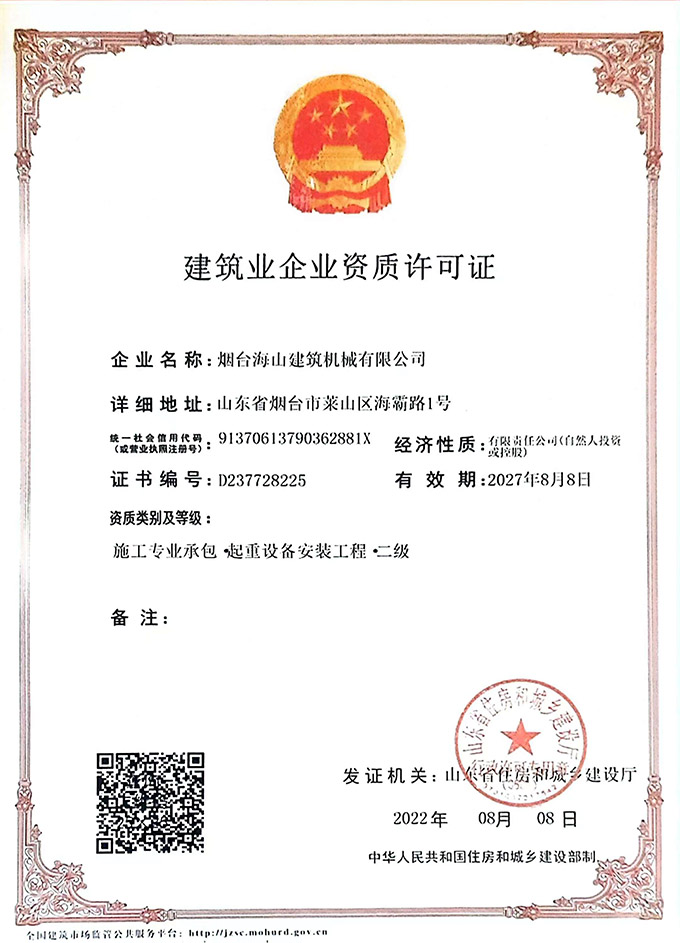 2022年度海山機(jī)械的建筑業(yè)企業(yè)資質(zhì)許可證書,以及特種設(shè)備生產(chǎn)許可證書均通過審批,具體如下圖: